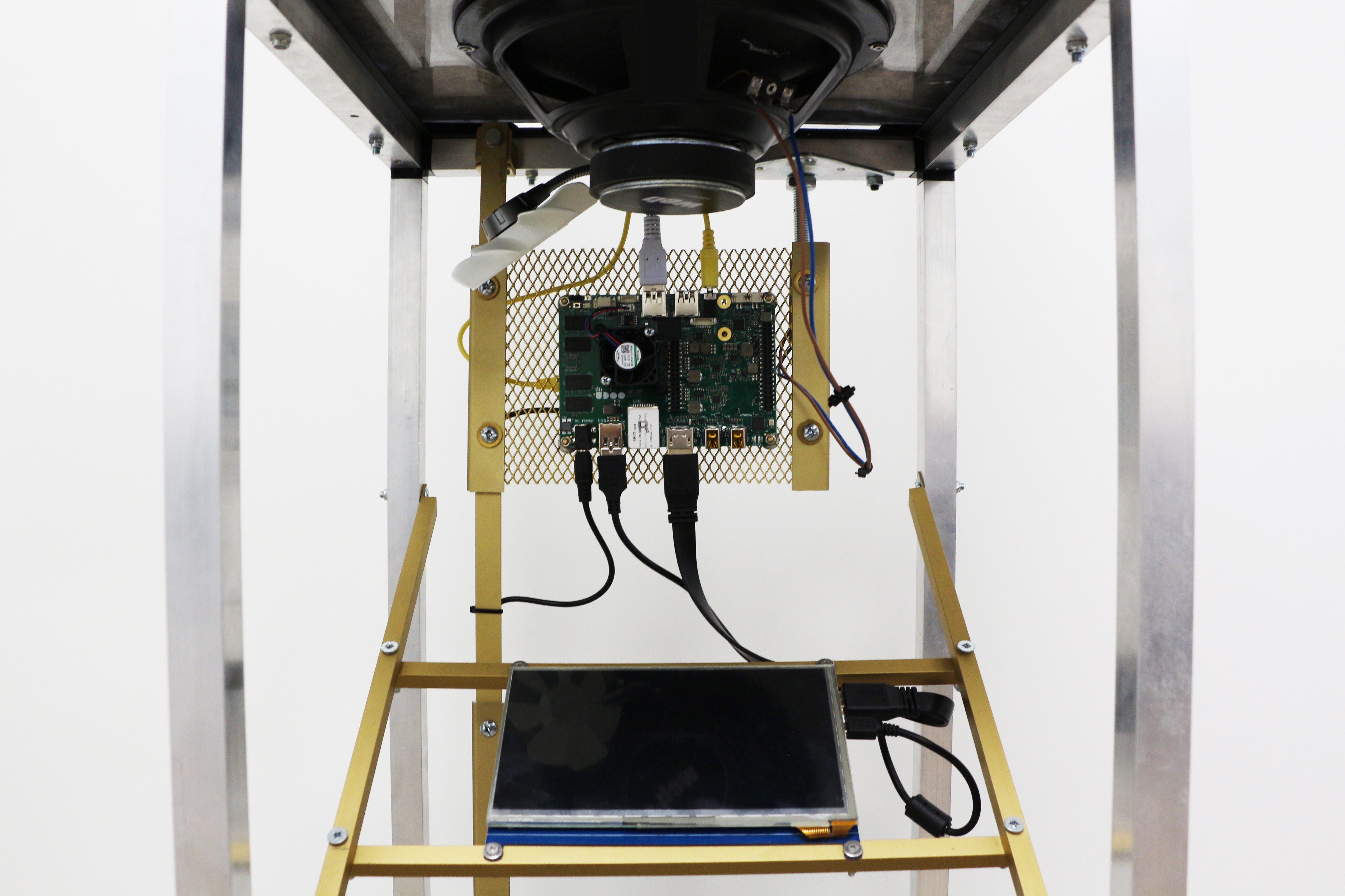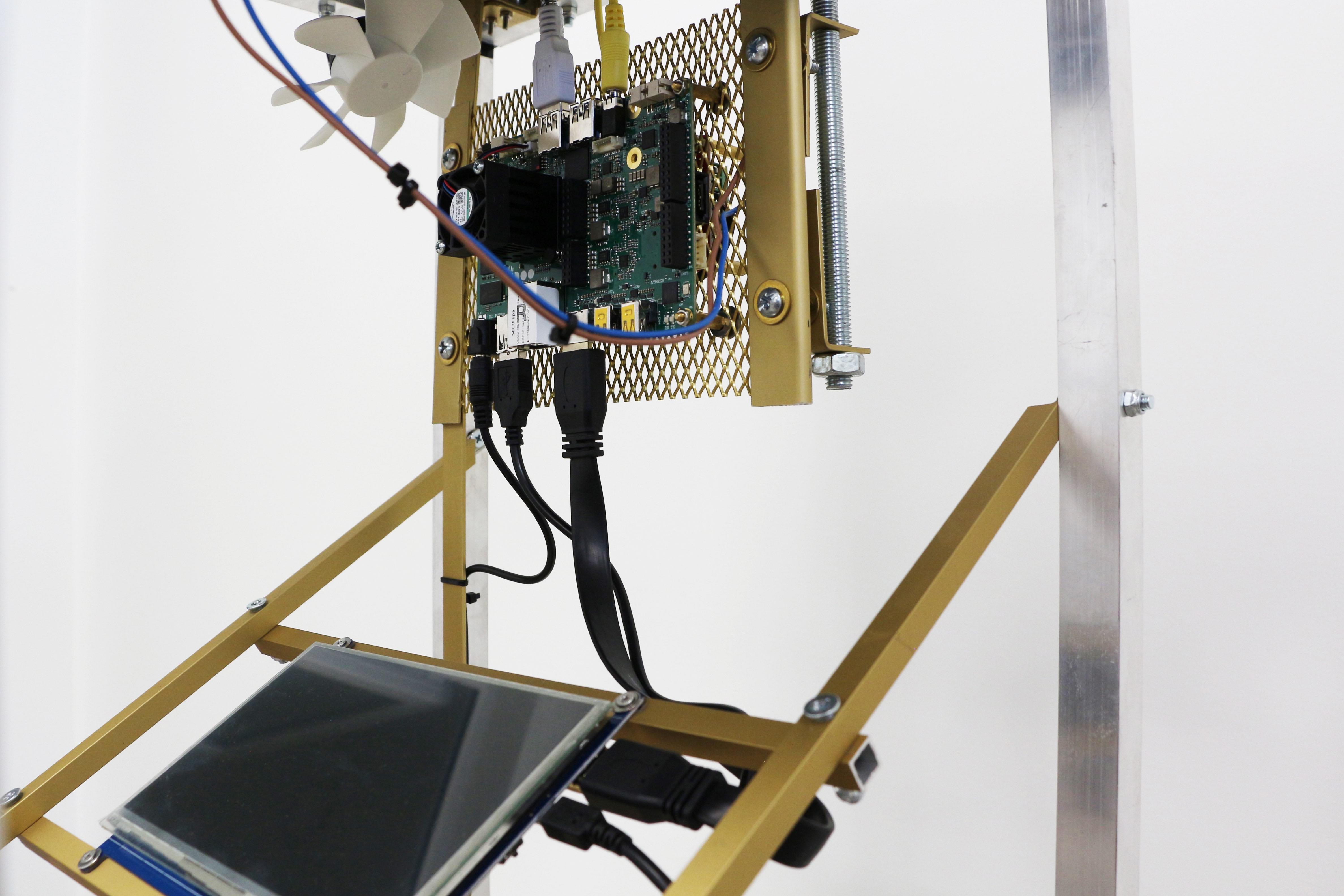 sonde: Steel, iron, plexiglass, solar panel, electric system, computer board, USB modem, SIM card, Arduino, gas sensors, microphone; installation: Steel, iron, plexiglass, computer board, screen, modem antenna, speaker, amplifier, ash.