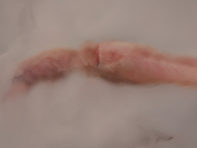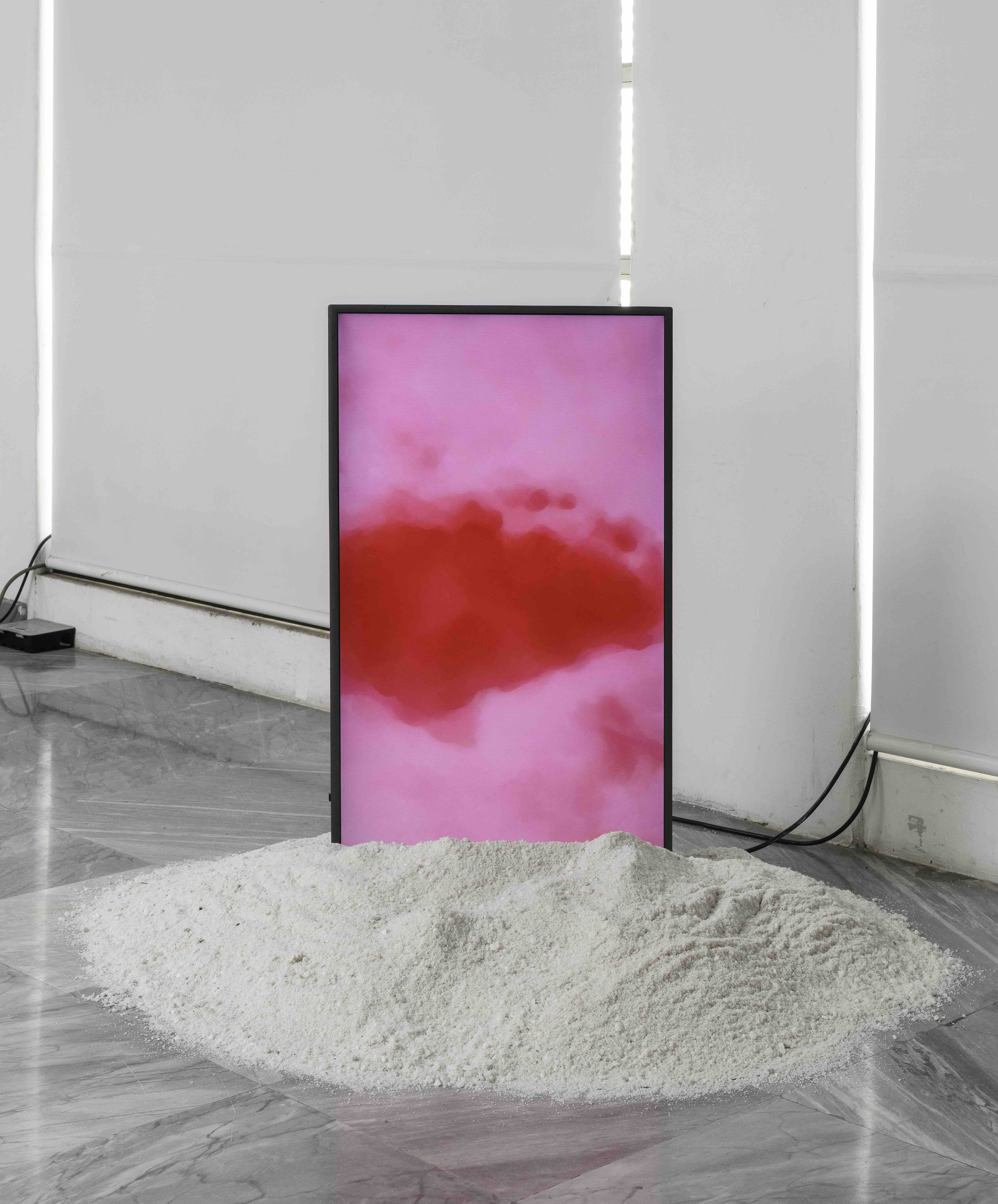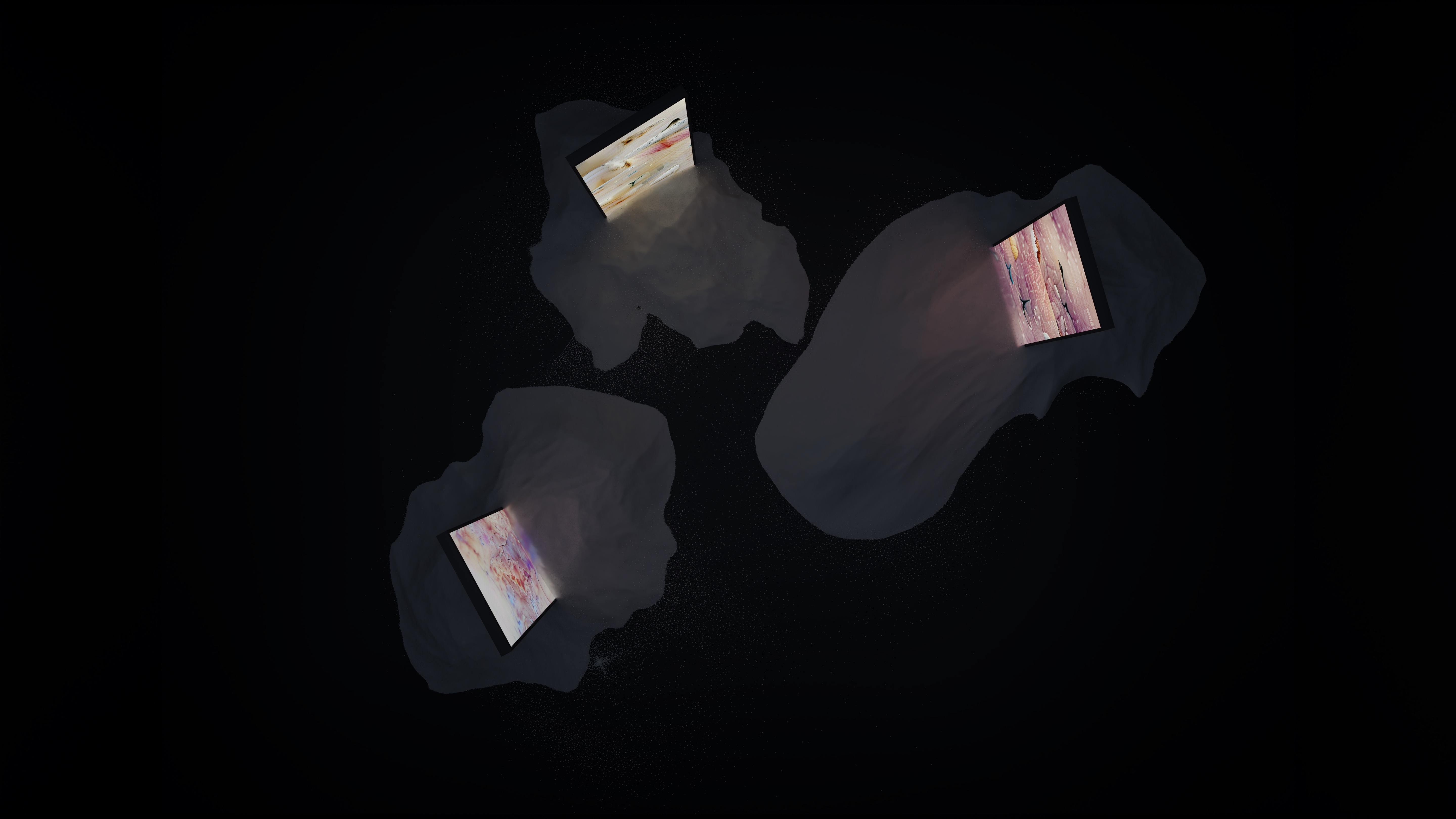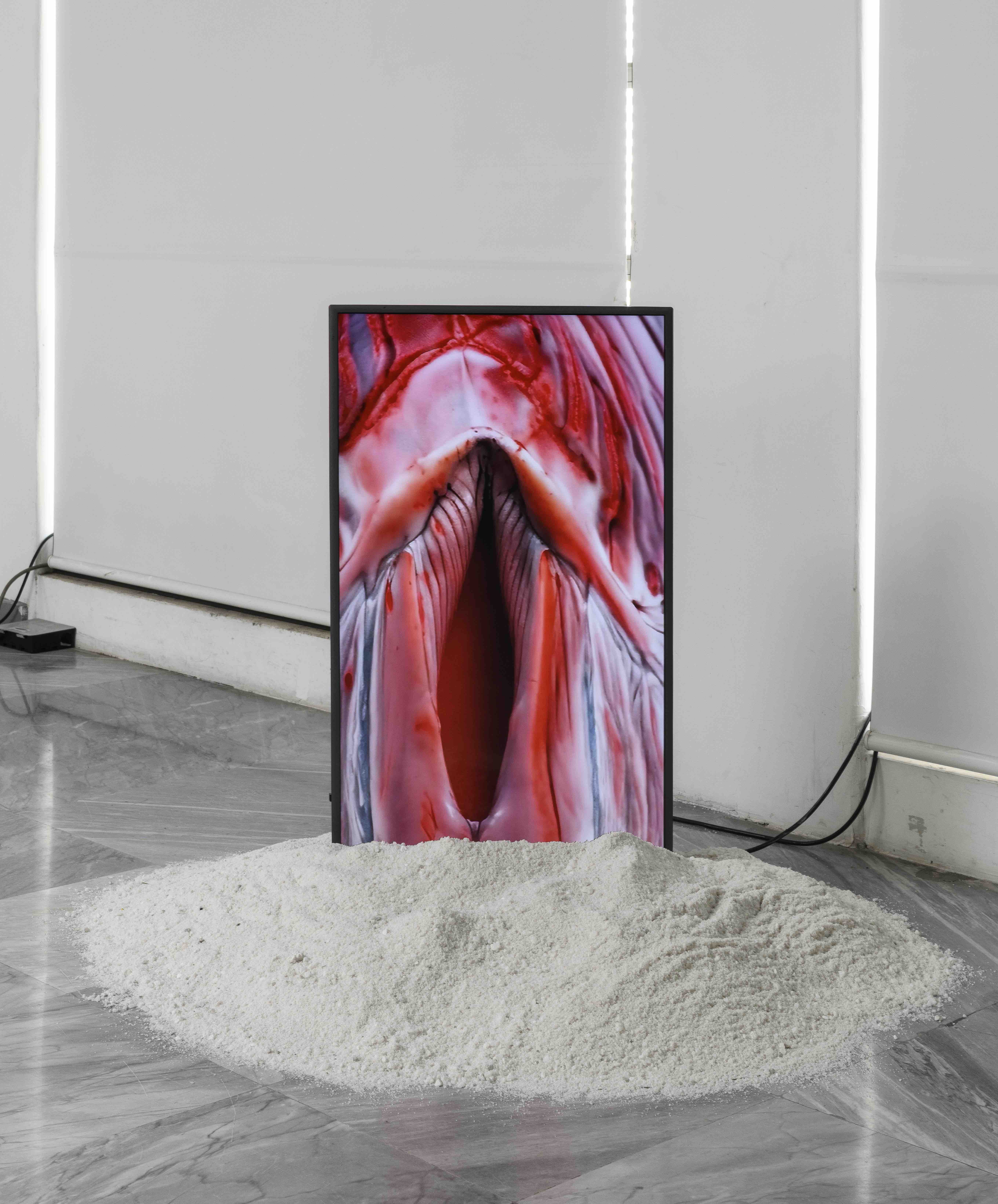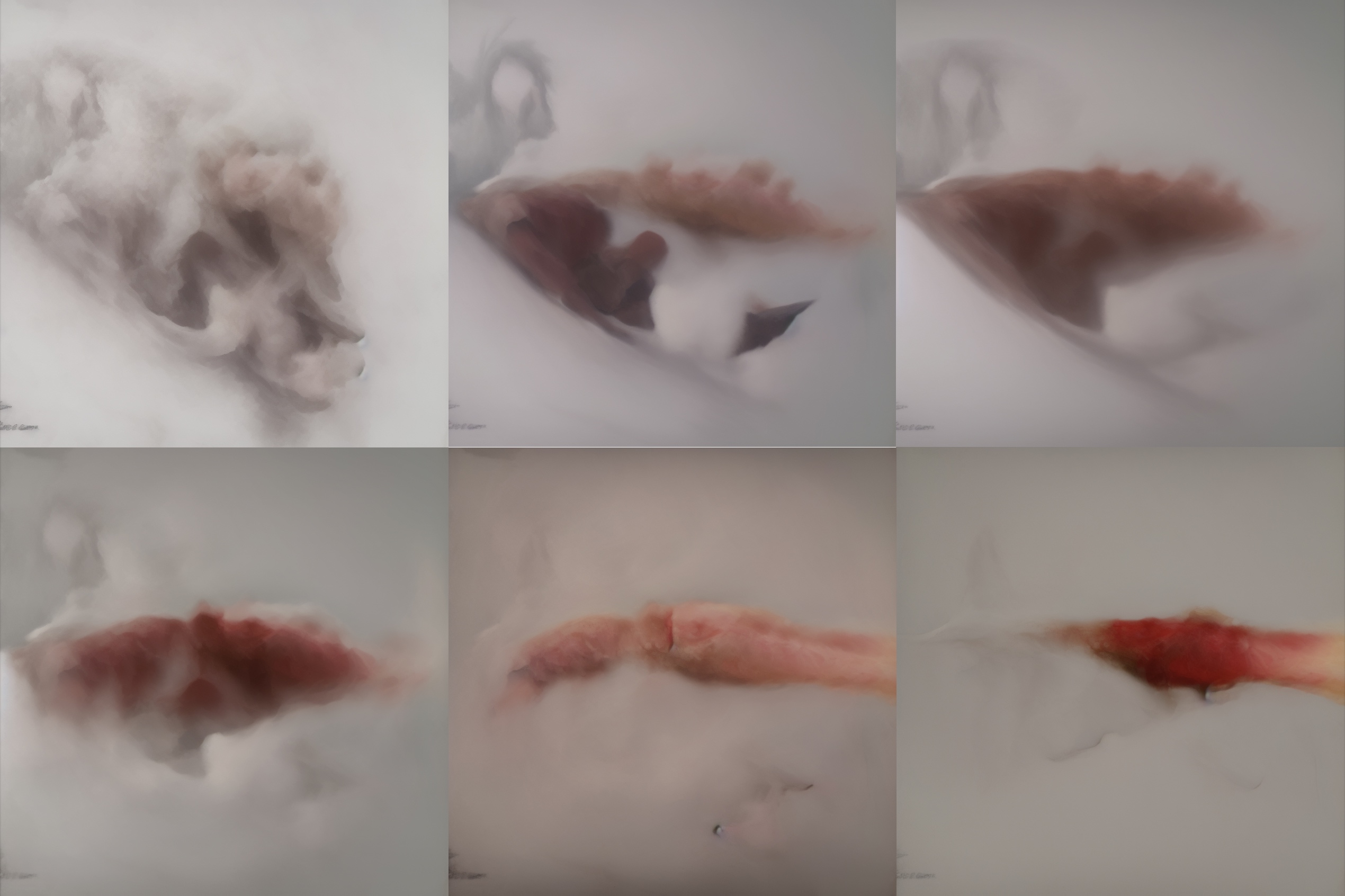 “Ciò che resta” (literal translation: “What is left”) makes use of traumatic marks left on the bodies of humans and aquatic species to train a Generative Adversarial Network (or GAN) through Machine Learning to create new forms of identity. GANs possess the peculiarity to produce unpredictable results from the stock images in the DataSet. The results of these processes are artefacts of possible scars, hybrid marks, at times undefined, of a utopian symbiosis between different species. The images are produced in real time and produced on three screens, which are vertically placed in the exhibit area.
