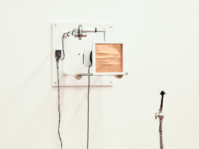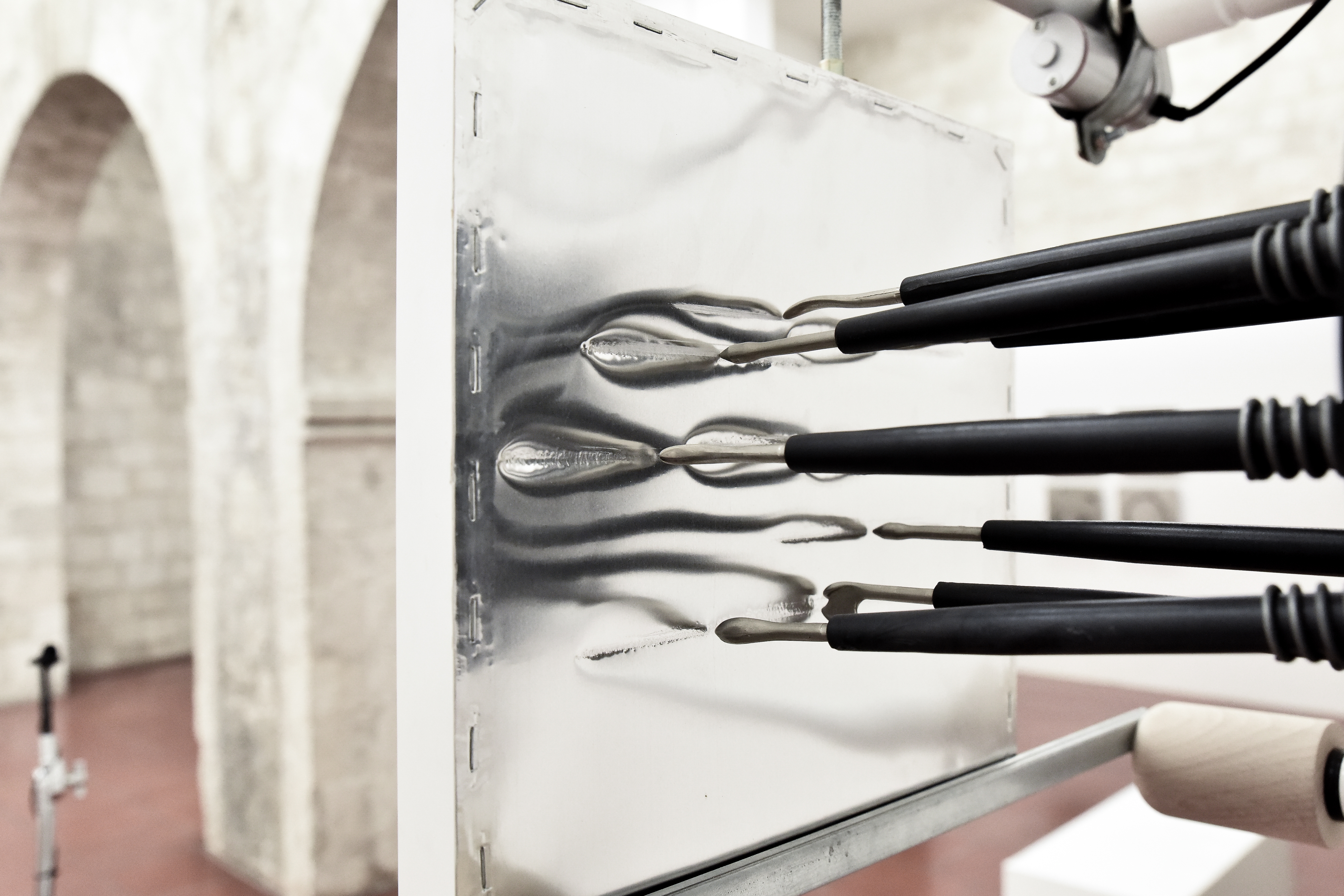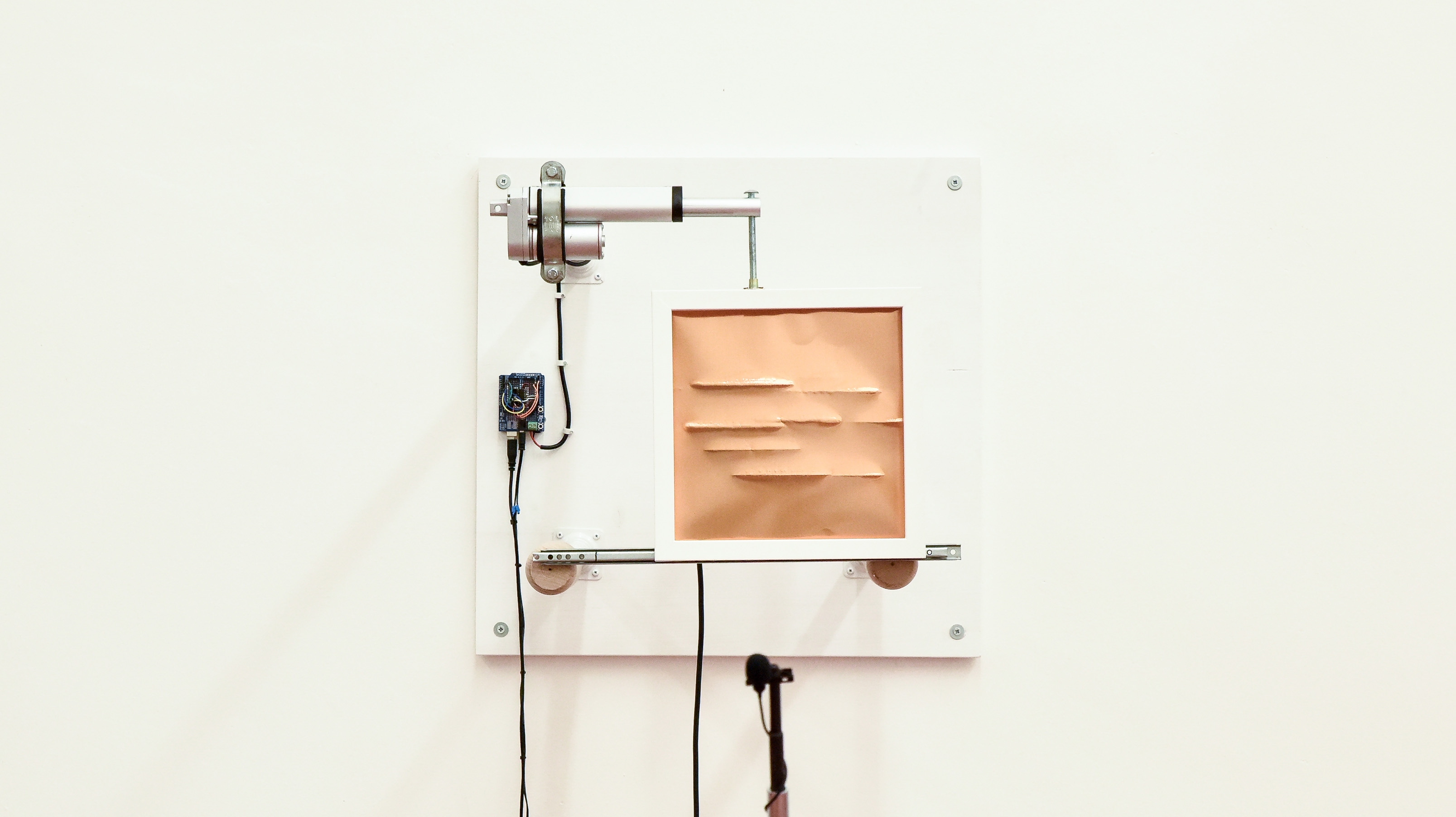 The work consists of a system which measures the sound intensity of the surroundings and then transcribes it into a carving on a sheet of copper.