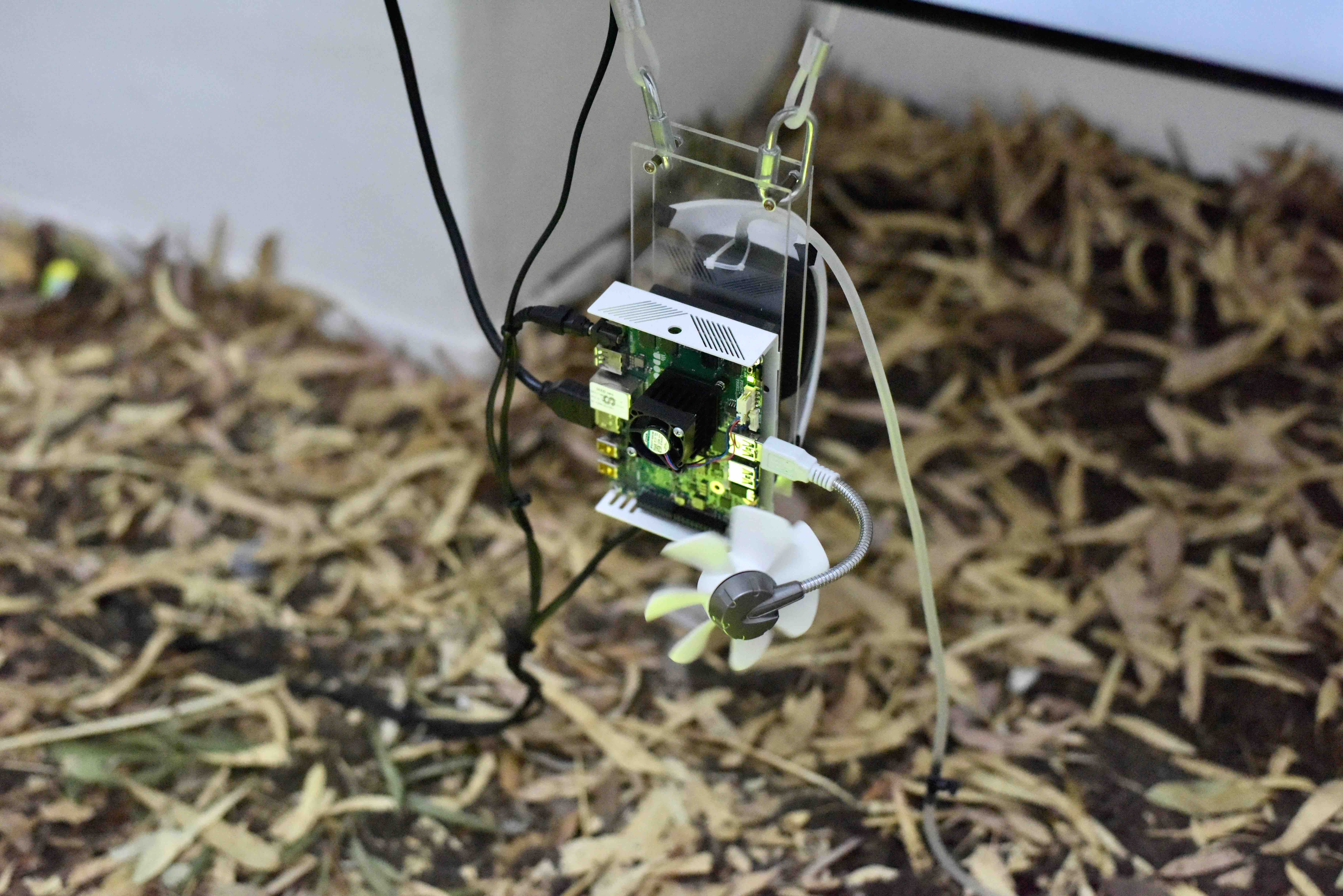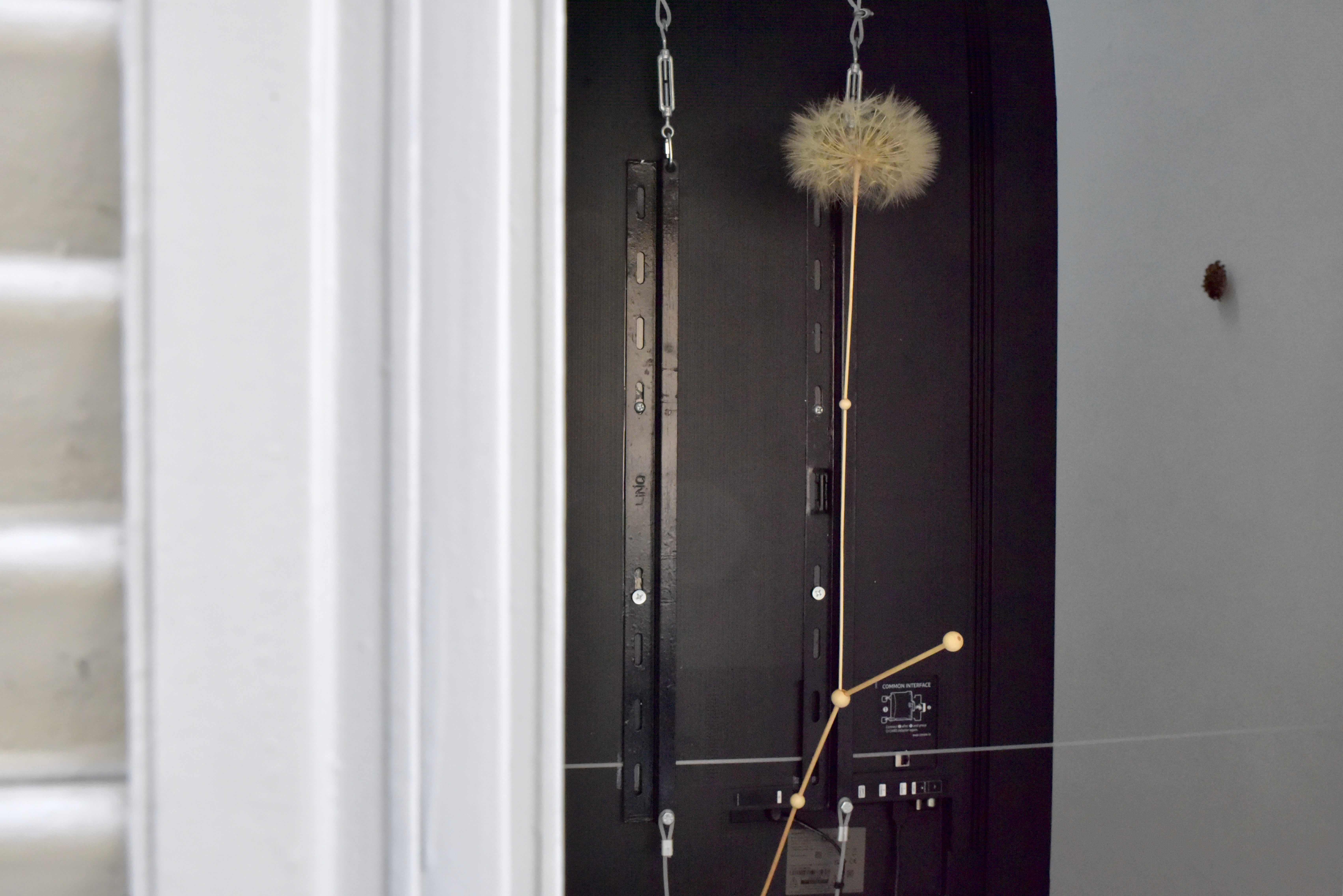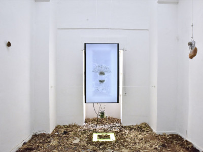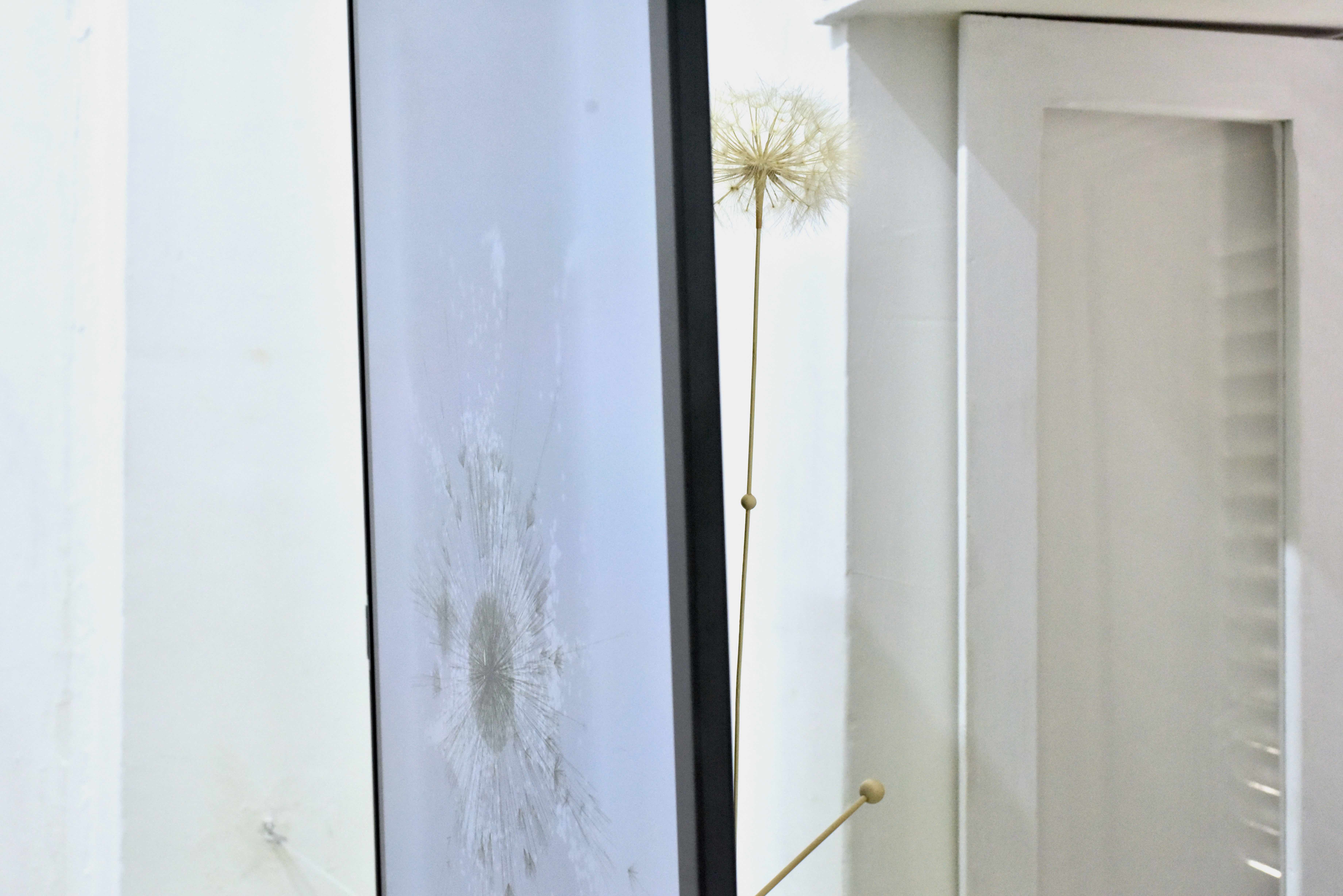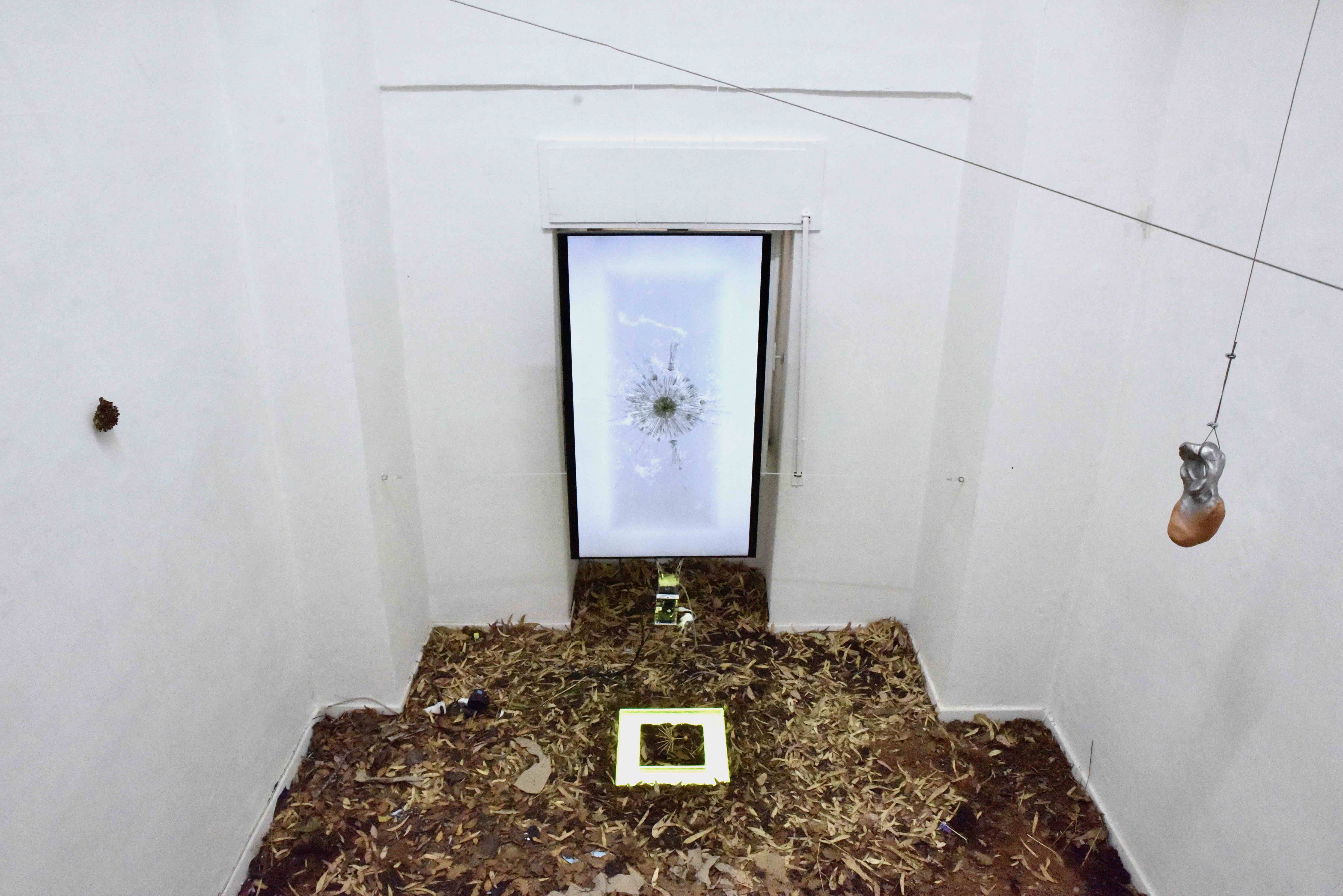 30 Audio/Video Loops, 4k screen, wooden sculpture, resinated dandelion, plexiglass, PC board, cool fan, led light.