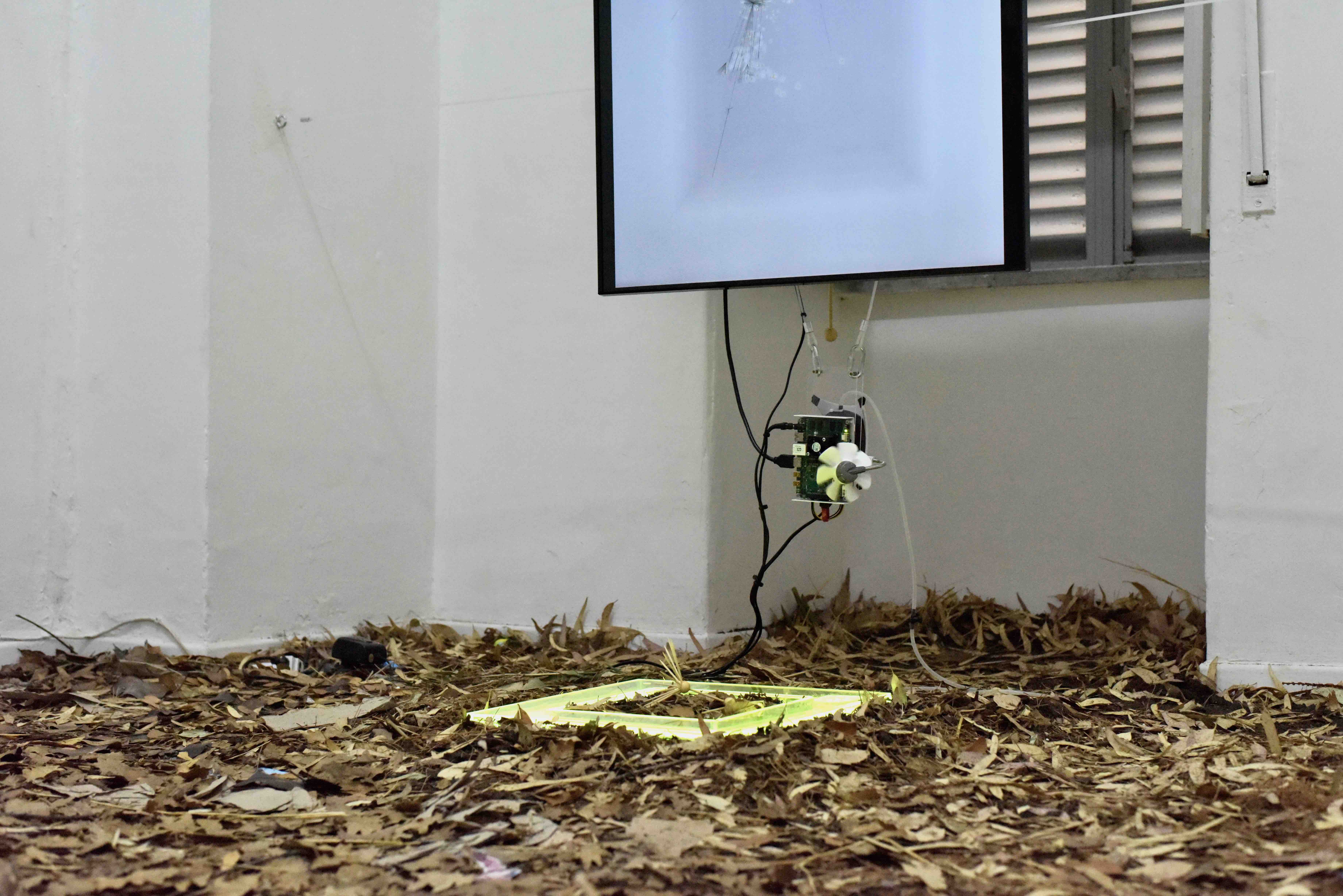 Mirror of a modern blinded society by appearance or a single-perspective vision, the screen hides behind itself a key element that only a few are led to discover. On the floor, an aquarium, in the shape of a box, bears the word “care” engraved on it, the same green box that in Machine Learning symbolizes the recognition region of a real object or element by classification and approximation.