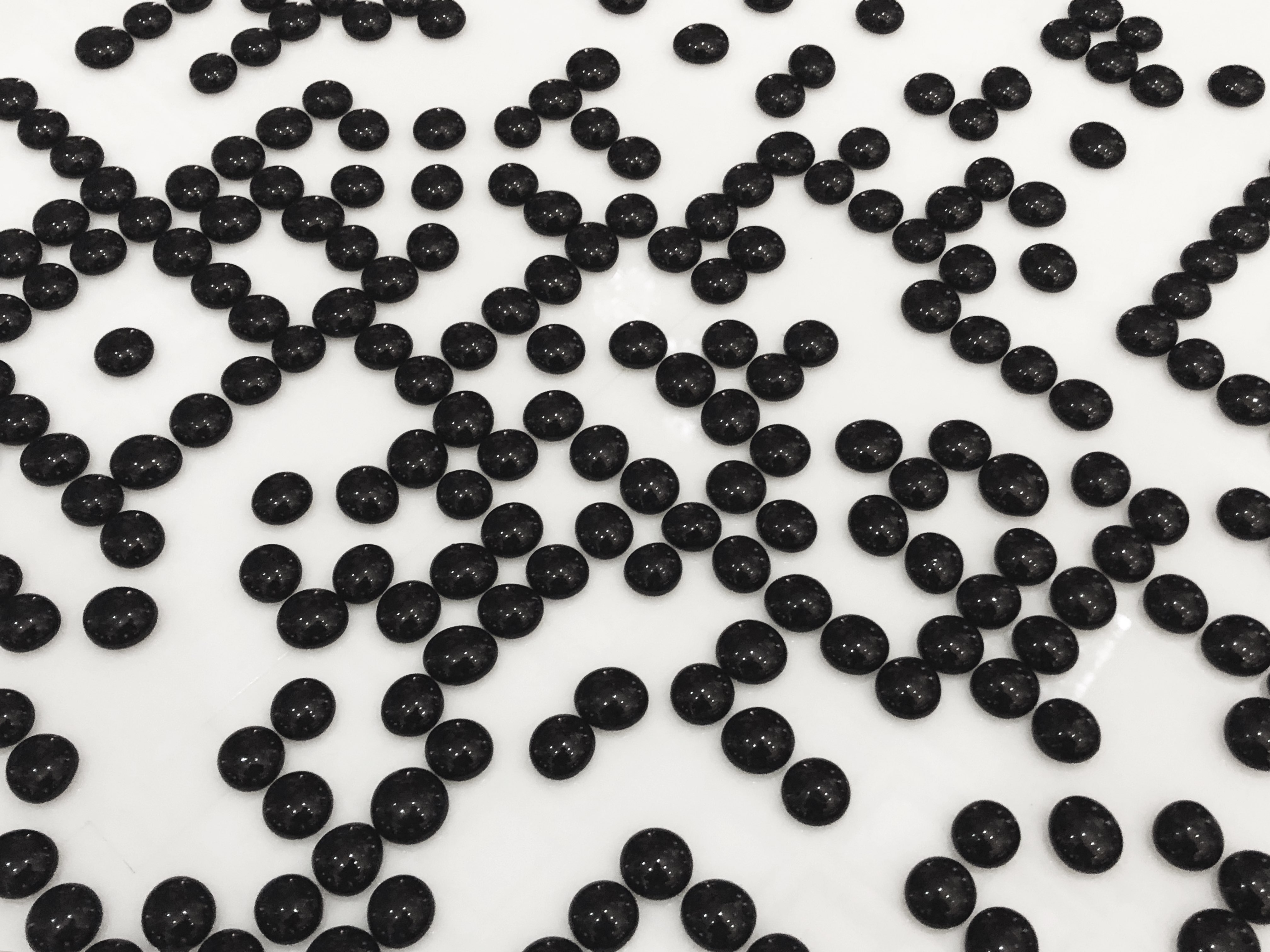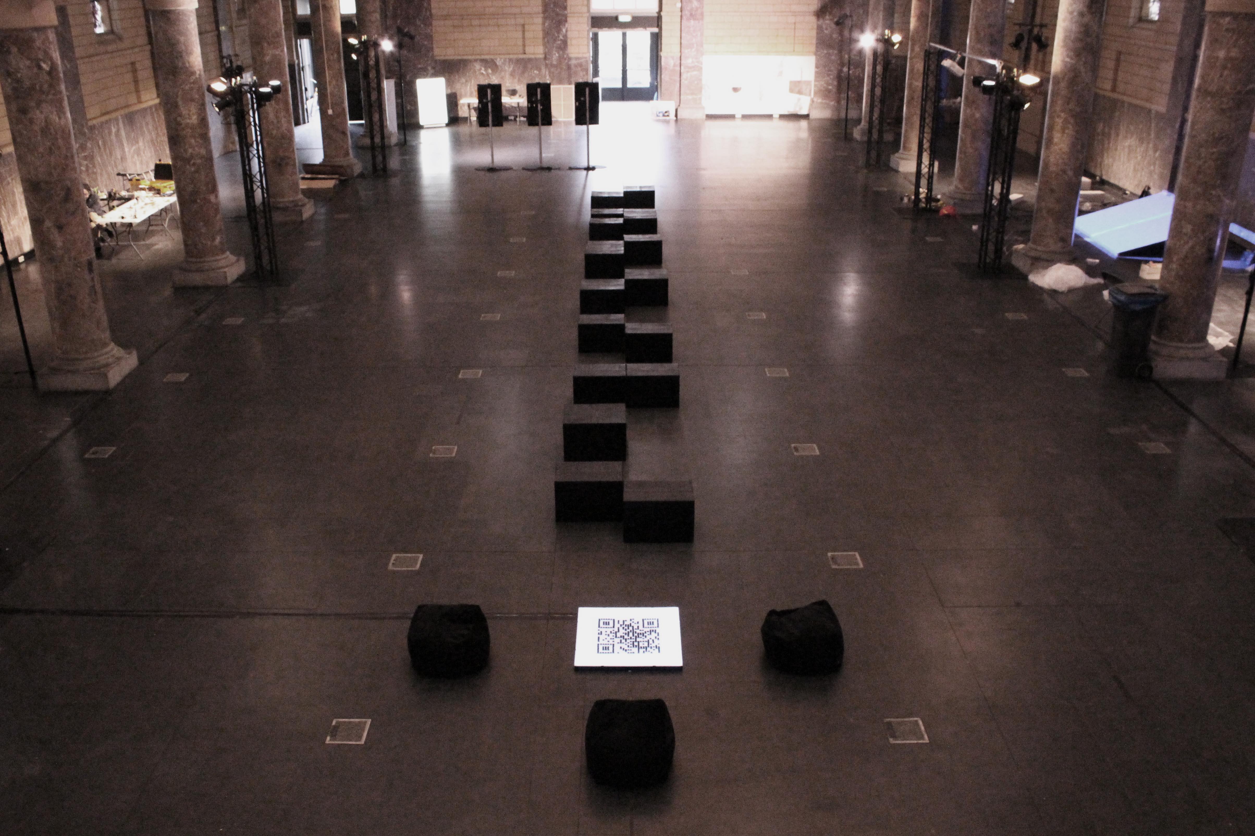 The sound flow is structured as an imaginary "sound-walk" which starts from silence and then explores how nature shifts as it approaches the audience. The QR code, which is made up of Go pawns of the same color, links to the composition. Perfectly embedded in this code you will find a word, spelled in the international Braille language. It means "insieme", or "together" in Italian. It is placed in the central nave of the church, as if the word became an extension of the code itself. The latter is made from recycled black cardboard boxes, their origins and stories left unknown to the viewer. However, if you pay close attention, these boxes will show close-to-imperceptible irregularities and minuscule flaws within its components…