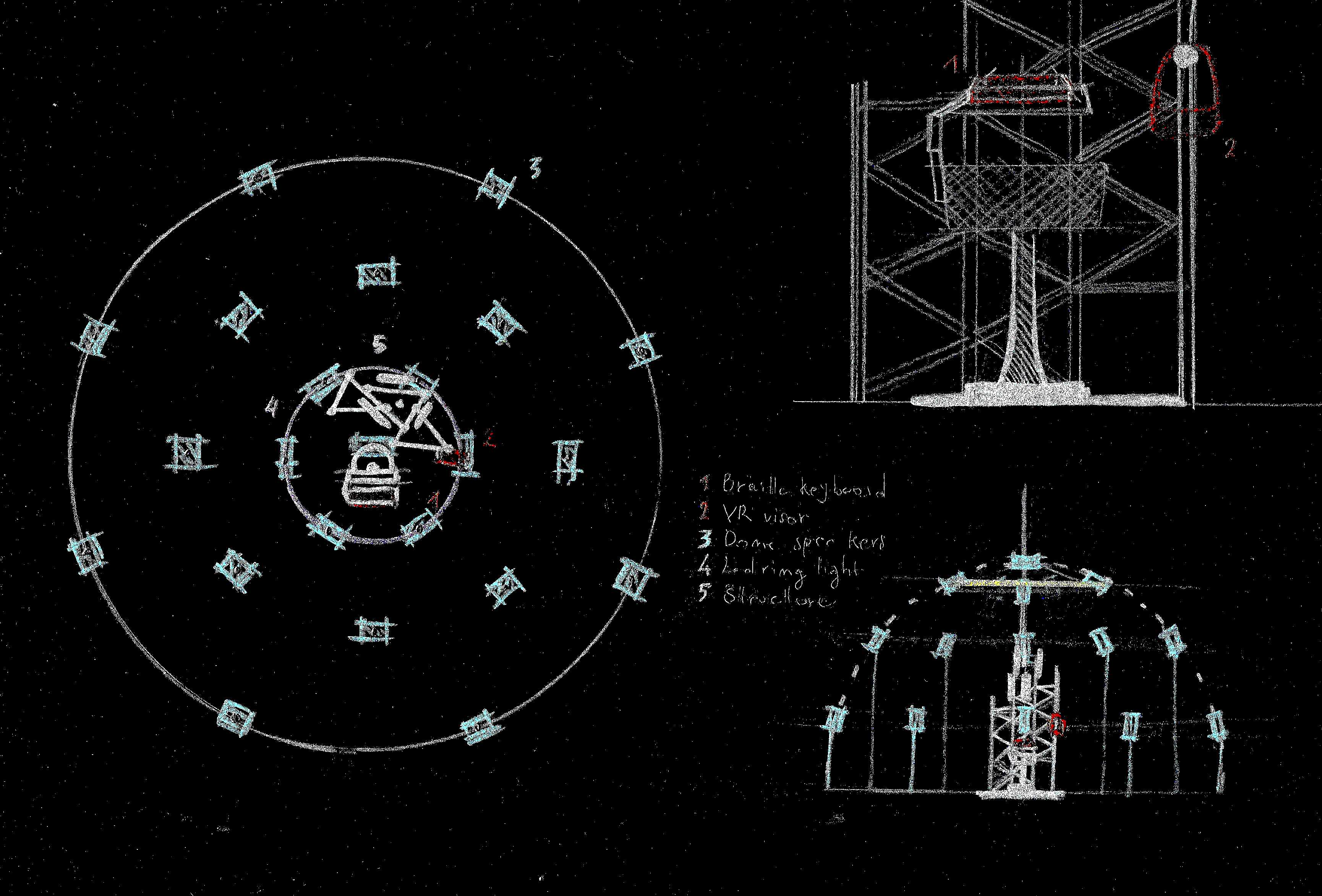 Thanks to the Italian National Research Council (CNR) and its high-fidelity hydrophone recordings, we have access to extensive datasets from otherwise inaccessible marine environments. These recordings provide rare access to underwater acoustic ecologies that are otherwise difficult to perceive, forming the empirical basis for our installation’s audio content and structure. The development unfolds in two phases: one asynchronous, focused on preparing and analyzing the data and one real-time, dedicated to sound synthesis and interactive control detailed in the Methodology section. Interaction with 504 unfolds in a blindfolded state, with the performer’s vision entirelyblinded. Through a Virtual Reality (VR) headset, repurposed solely as a gyroscopic sensor, the performer determines their direction of observation. Seated on a rotating chair, they operate a digital Braille keyboard, where the hexagrammatic keys become directional controls within the acoustic universe.