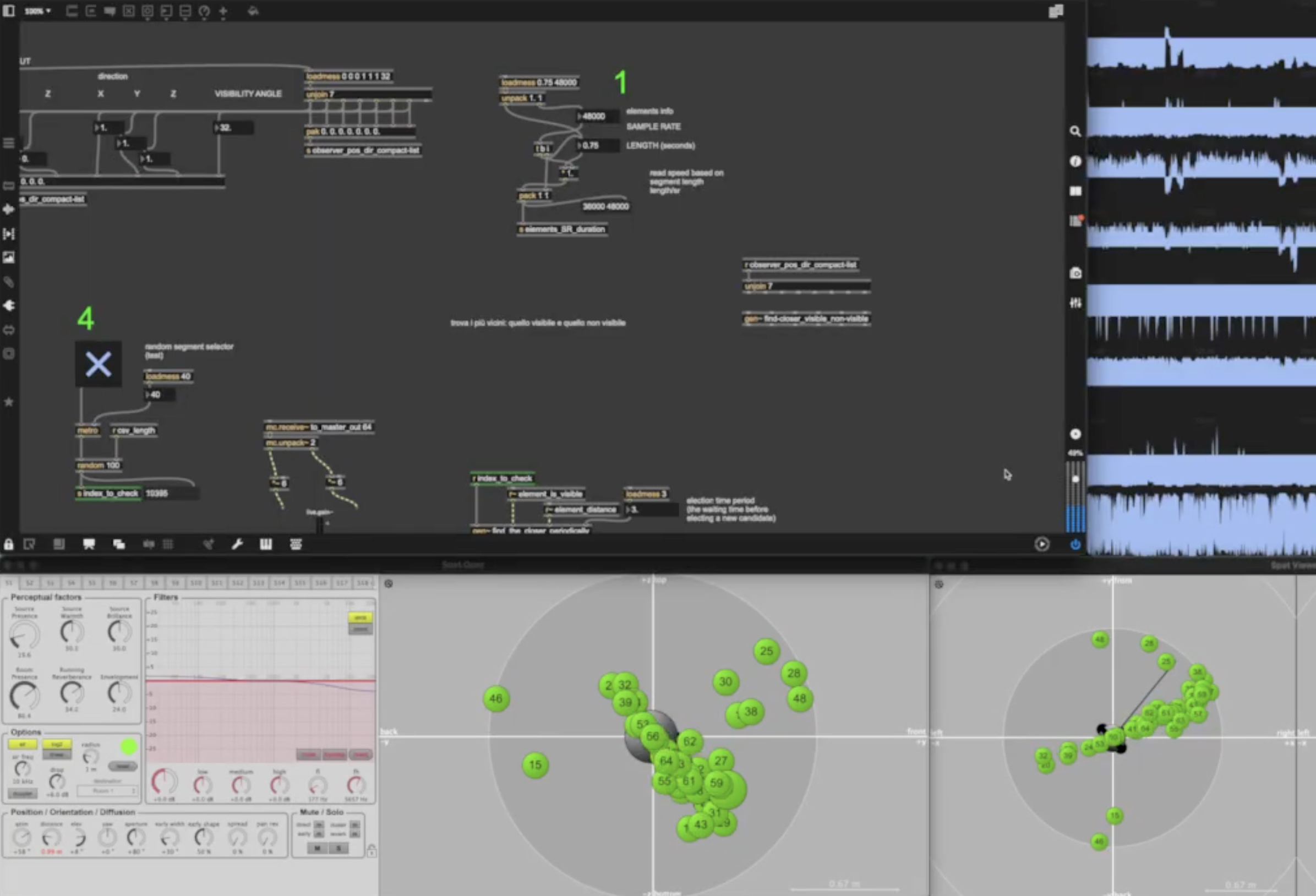 Its modular and performance-oriented nature makes it both a creative and technical tool. Moreover, it includes powerful libraries for handling complex multichannel techniques, such as Ambisonics via Spat~ by IRCAM, and it offers the ability to write sample-level optimized algorithms using Gen~, a MaxMSP subsystem that compiles code to reduce latency and improve efficiency.